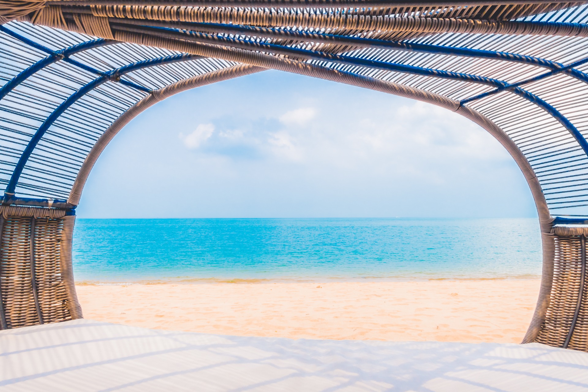 - 休閒區域(有遮陽傘躺椅、小圓桌和綁在樹上的鞦韆)