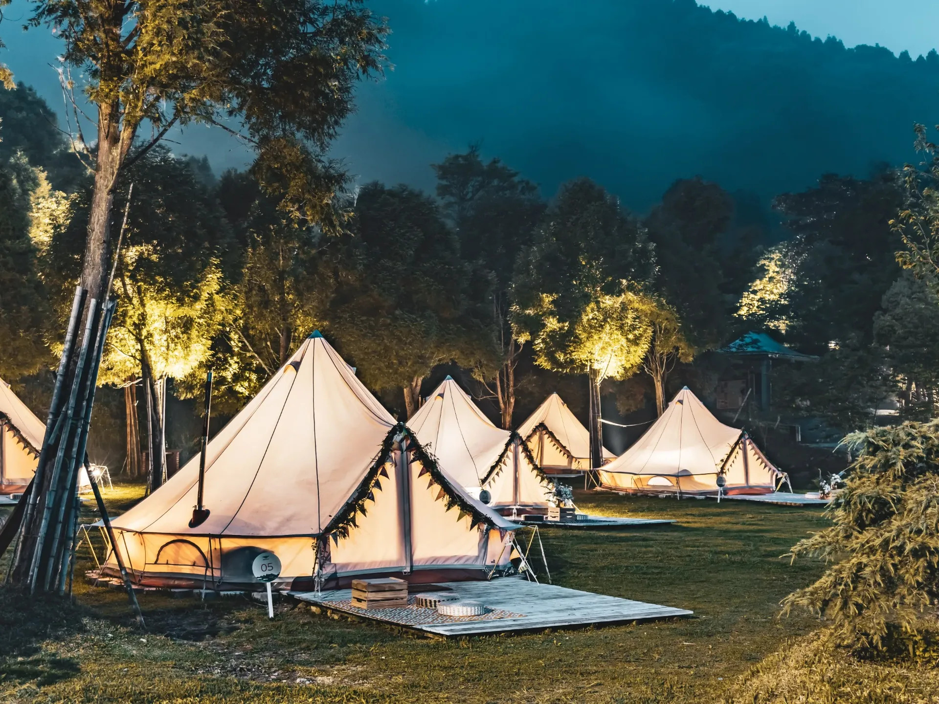 距離活動沙灘一小段距離、依山傍水(?)的草坪,每位嘉賓分配一頂在舖有木板的地面上搭建的高級帳篷,帳篷內有配備單人床墊和棉被、枕頭。